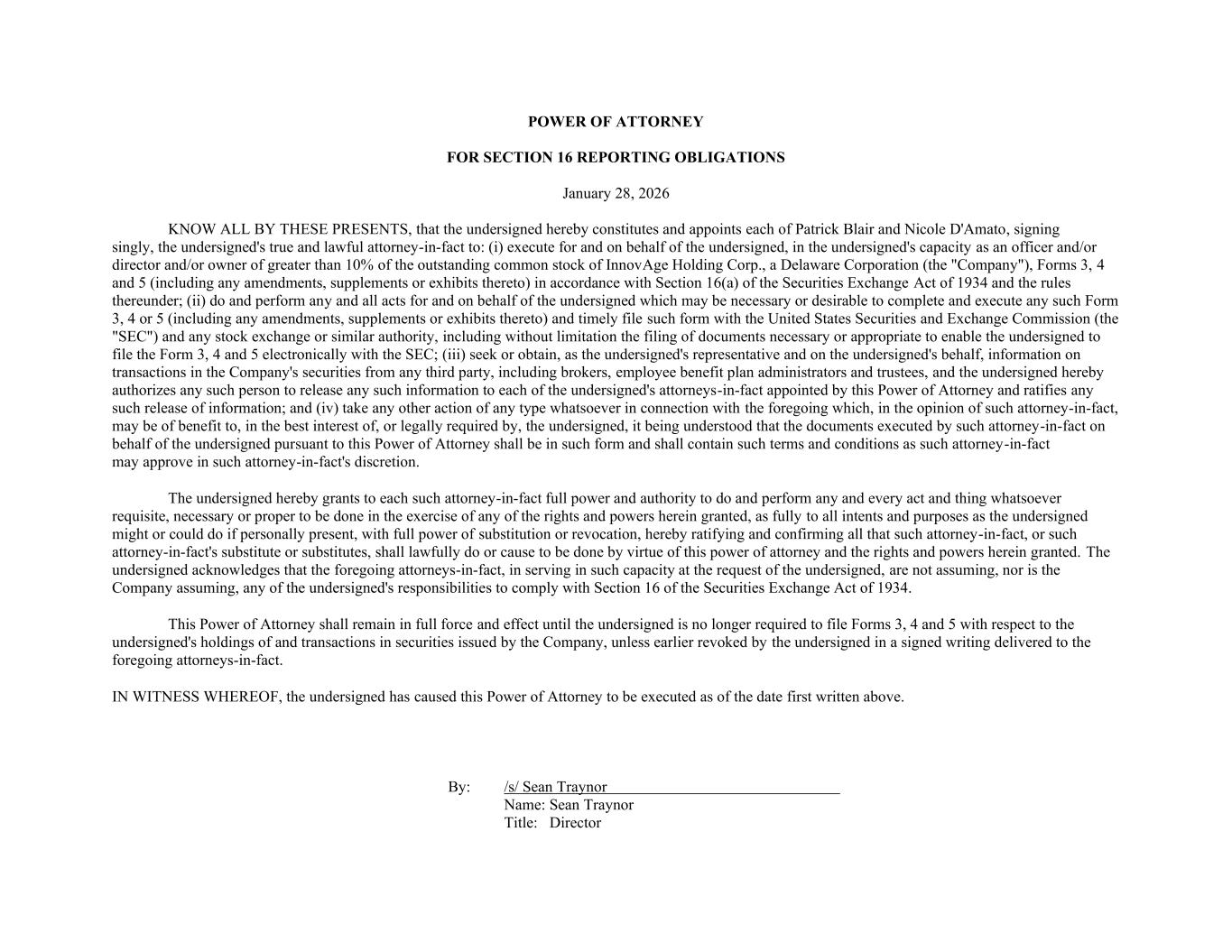POWER OF ATTORNEY FOR SECTION 16 REPORTING OBLIGATIONS January 28, 2026 KNOW ALL BY THESE PRESENTS, that the undersigned hereby constitutes and appoints each of Patrick Blair and Nicole D'Amato, signing singly, the undersigned's true and lawful attorney-in-fact to: (i) execute for and on behalf of the undersigned, in the undersigned's capacity as an officer and/or director and/or owner of greater than 10% of the outstanding common stock of InnovAge Holding Corp., a Delaware Corporation (the "Company"), Forms 3, 4 and 5 (including any amendments, supplements or exhibits thereto) in accordance with Section 16(a) of the Securities Exchange Act of 1934 and the rules thereunder; (ii) do and perform any and all acts for and on behalf of the undersigned which may be necessary or desirable to complete and execute any such Form 3, 4 or 5 (including any amendments, supplements or exhibits thereto) and timely file such form with the United States Securities and Exchange Commission (the "SEC") and any stock exchange or similar authority, including without limitation the filing of documents necessary or appropriate to enable the undersigned to file the Form 3, 4 and 5 electronically with the SEC; (iii) seek or obtain, as the undersigned's representative and on the undersigned's behalf, information on transactions in the Company's securities from any third party, including brokers, employee benefit plan administrators and trustees, and the undersigned hereby authorizes any such person to release any such information to each of the undersigned's attorneys-in-fact appointed by this Power of Attorney and ratifies any such release of information; and (iv) take any other action of any type whatsoever in connection with the foregoing which, in the opinion of such attorney-in-fact, may be of benefit to, in the best interest of, or legally required by, the undersigned, it being understood that the documents executed by such attorney-in-fact on behalf of the undersigned pursuant to this Power of Attorney shall be in such form and shall contain such terms and conditions as such attorney-in-fact may approve in such attorney-in-fact's discretion. The undersigned hereby grants to each such attorney-in-fact full power and authority to do and perform any and every act and thing whatsoever requisite, necessary or proper to be done in the exercise of any of the rights and powers herein granted, as fully to all intents and purposes as the undersigned might or could do if personally present, with full power of substitution or revocation, hereby ratifying and confirming all that such attorney-in-fact, or such attorney-in-fact's substitute or substitutes, shall lawfully do or cause to be done by virtue of this power of attorney and the rights and powers herein granted. The undersigned acknowledges that the foregoing attorneys-in-fact, in serving in such capacity at the request of the undersigned, are not assuming, nor is the Company assuming, any of the undersigned's responsibilities to comply with Section 16 of the Securities Exchange Act of 1934. This Power of Attorney shall remain in full force and effect until the undersigned is no longer required to file Forms 3, 4 and 5 with respect to the undersigned's holdings of and transactions in securities issued by the Company, unless earlier revoked by the undersigned in a signed writing delivered to the foregoing attorneys-in-fact. IN WITNESS WHEREOF, the undersigned has caused this Power of Attorney to be executed as of the date first written above. By: /s/ Sean Traynor Name: Sean Traynor Title: Director